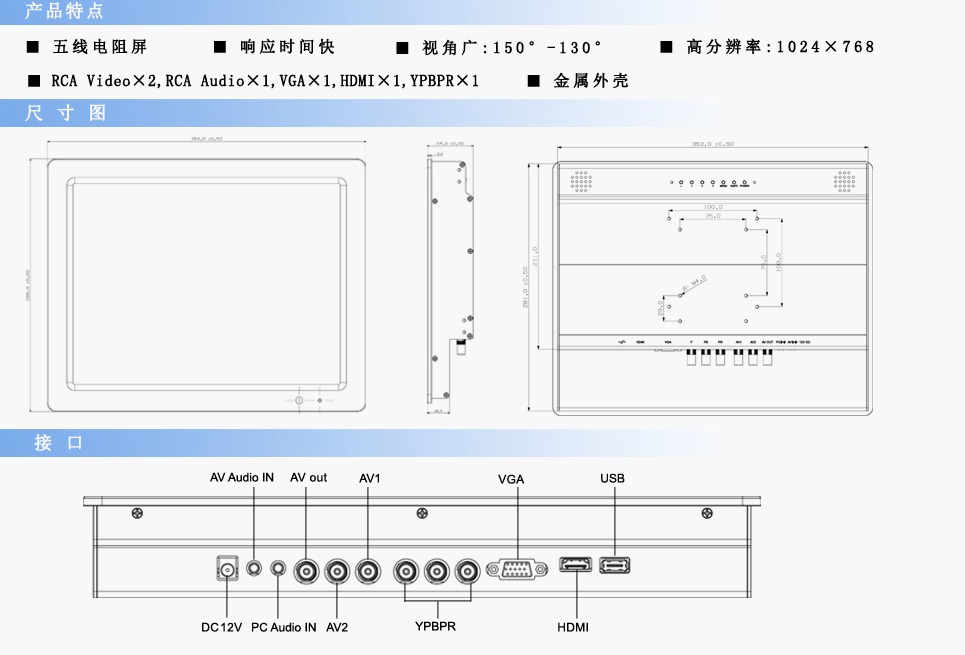 | 輸入信號 | RCA Video×2,RCA Audio×1,VGA×1,HDMI×1,YPBPR×1 | ||