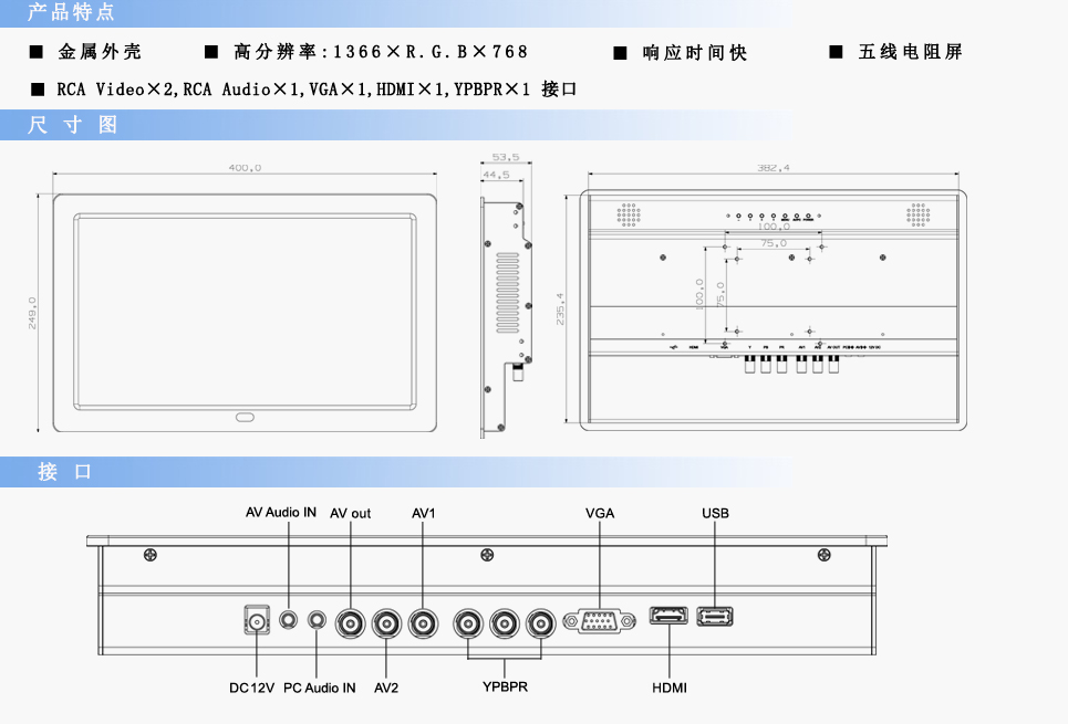 輸入信號:RCA Video×2,RCA Audio×1,VGA×1,HDMI×1,YPBPR×1