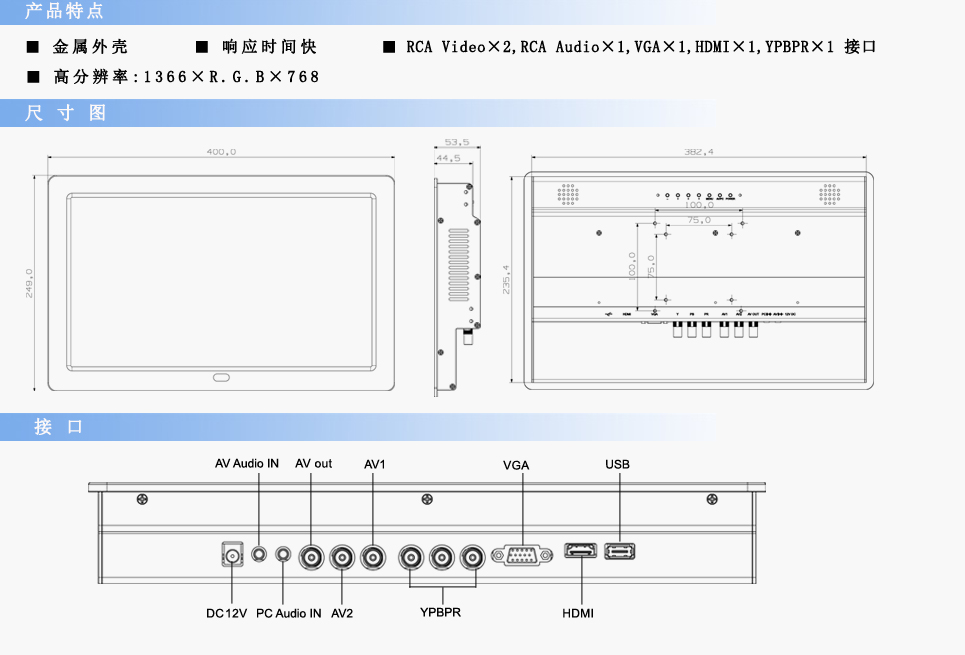 輸入信號:RCA Video×2,RCA Audio×1,VGA×1,HDMI×1,YPBPR×1
