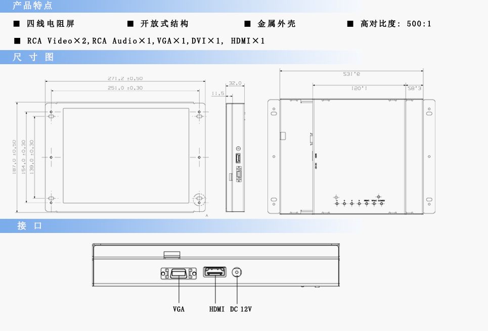 | 輸入信號(hào) | RCA Video×2,RCA Audio×1,VGA×1,DVI×1, HDMI×1 | ||
