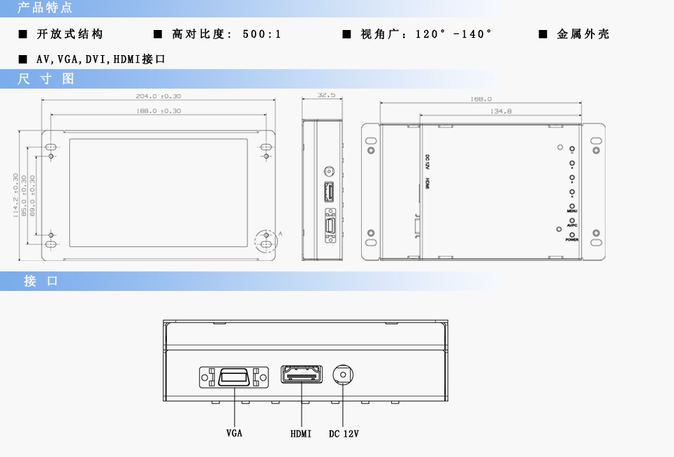 | 輸入信號 | RCA Video×2,RCA Audio×1,VGA×1,DVI×1,HDMI×1 | ||